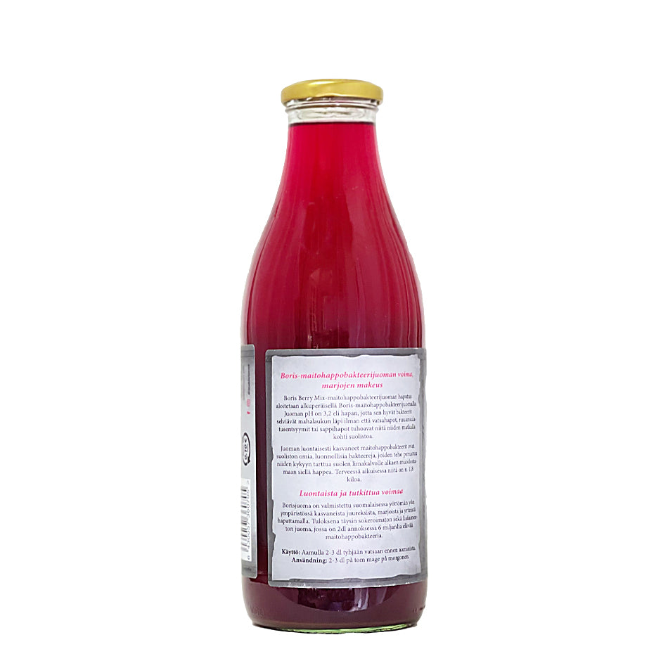 Berry Mix -juoman pohjana on sama elävien maitohappobakteerien yhdistelmä kuin alkuperäisessä Boris-juomassa. Lisäksi se sisältää runsaasti entsyymejä, flavonoideja, ravintokuitua, vitamiineja ja prebiootteja, jotka tukevat ruoansulatusta ja kokonaisvaltaista hyvinvointia luonnollisesti.