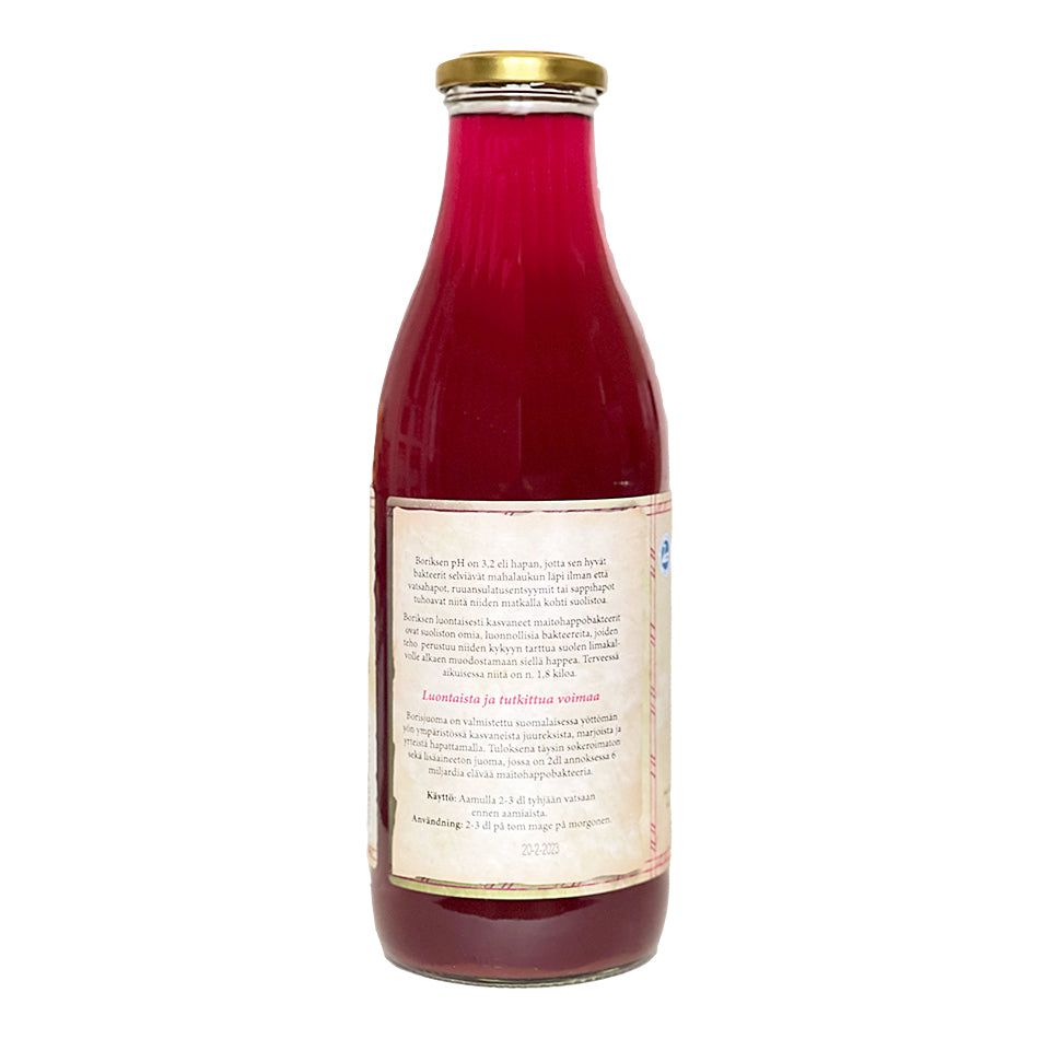 Boris-maitohappobakteerijuoma on luonnollinen ja elinvoimainen juoma, joka valmistetaan huolella valikoiduista luomujuureksista, -marjoista ja -yrteistä perinteisellä hapatusmenetelmällä. Tuloksena on täysin sokeroimaton ja lisäaineeton juoma, joka tukee hyvinvointia luonnon omilla voimilla.