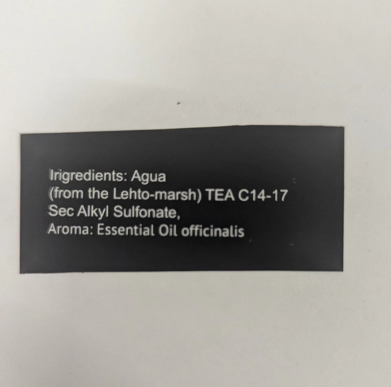 Ingredients: 94% Aqua from Lehtosuo marsh, sphagnum 6%, TEA sec C14-17 alkane sulphonate (40%), PEG-5 cocamide (4%), Cocamine MEA (0,4%) 0,001% Aroma rosmarin Total: 100%