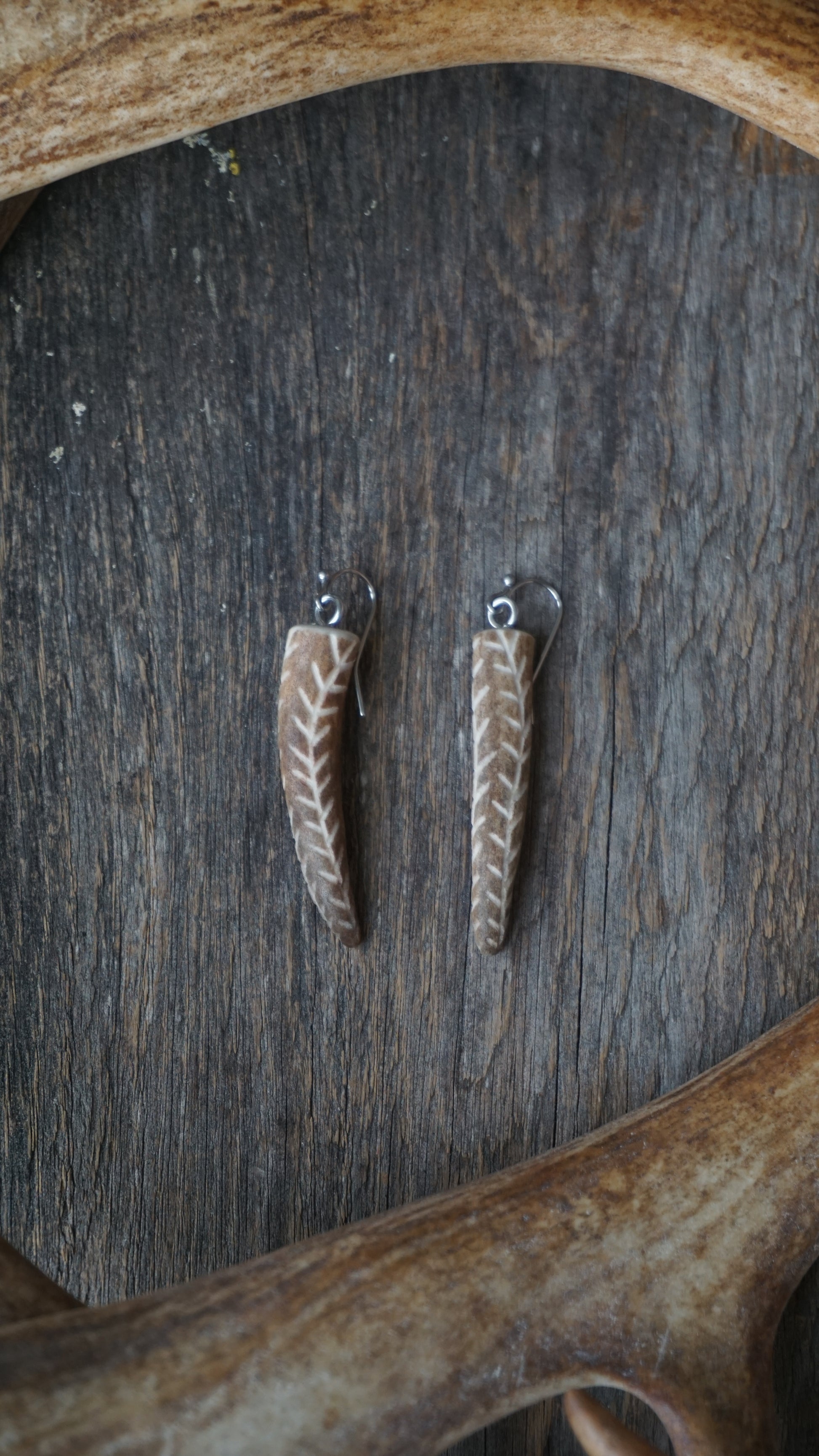 KÖYNNÖS-korvakorut on valmistettu poronsarven tunnistetuimmasta kohdasta eli sarven päätypaloista, niiden muoto on luonnostaan täydellinen korvakoruiksi. Sarven pintaan kaiverrettu kuvio muistuttaa köynnöskasveja ja kiemurtelee ympäri sarvea kasvin tavoin.