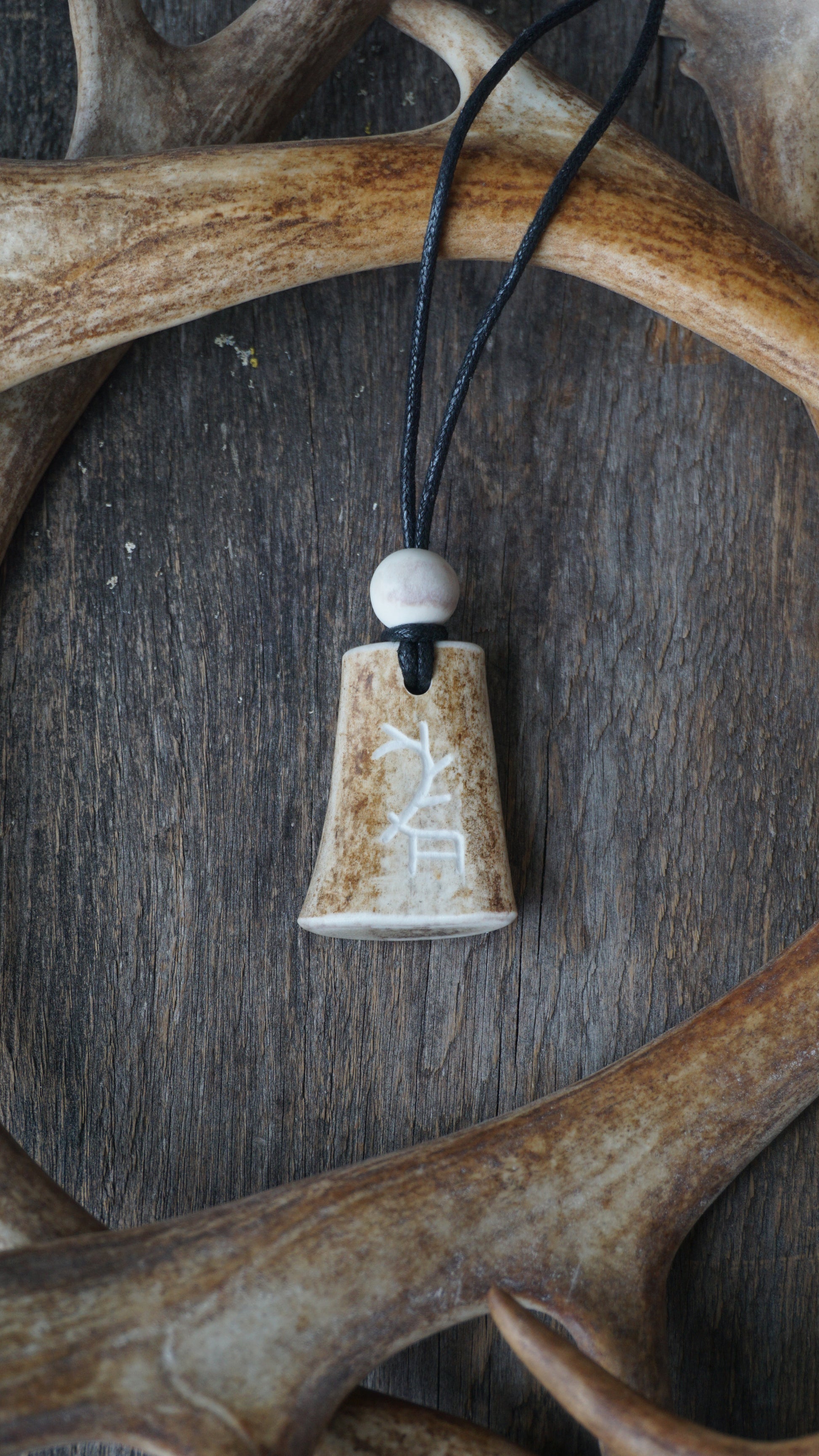 PORO-riipus on täyttä poronsarvea ja sen pintaan on kaiverrettu tietenkin mikäs muukaan kuin itse poro! Riipusta koristava helmi on myös valmistettu poronsarvesta.