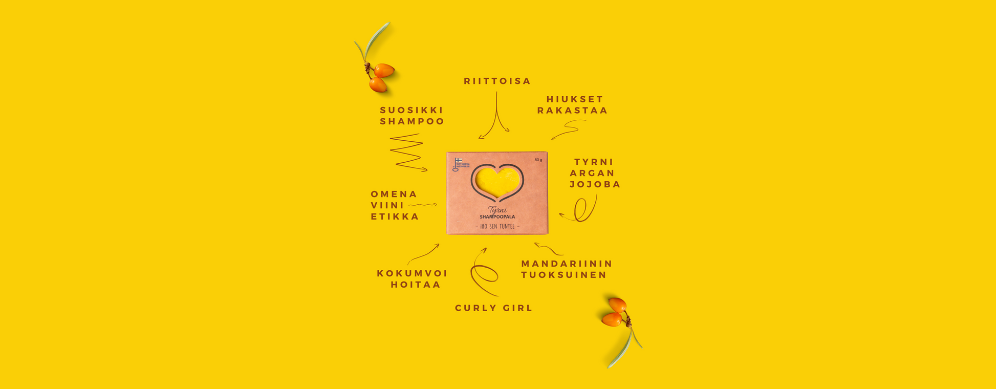 Sisältää laadukkaita hiuksia ja hiuspohjaa hoitavia kookosöljypohjaisia ainesosia, tyrniöljyä, arganöljyä, jojobaöljyä ja omenaviinietikkaa sekä valkosavea. Tyrni on erittäin hoitava shampoopala ja täysin tahmaamaton. Tarvittaessa voit käyttää hoitoainepalaa. Tuoksuna aito eteerinen sisilialainen mandariiniöljy. Tyrni soveltuu Curly Girl metodin mukaiseen shampoopesuun.